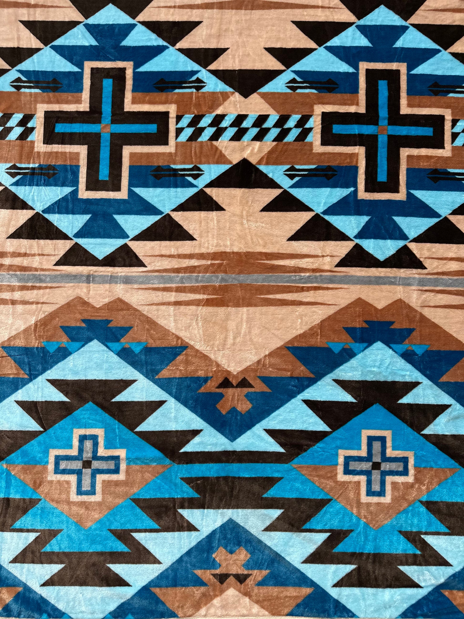 A37 - Tan & Blue Southwest Aztec Flannel Blanket